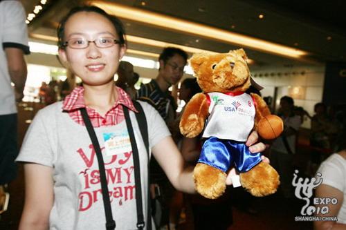來自上海的網(wǎng)友張慧珠一家無疑是今天參觀美國館的人群中最幸運的,他們一家三口全部抽中了“網(wǎng)上世博會展館直通車”美國站的參與資格。不過,最讓張慧珠高興的是,她可以和先生、女兒一起享受這種貴賓待遇,“我女兒捧著那個泰迪熊喜歡得不得了呢!”