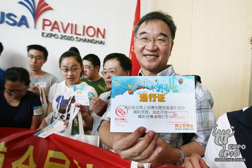 馬丁為網(wǎng)友頒發(fā)“網(wǎng)上世博會展館直通車”通行證