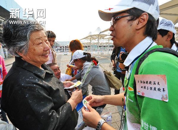 10月16日,志愿者在世博園為一位來自寧波85歲的戴桂芳老人送上鮮花和紀(jì)念徽章。新華社記者 張國(guó)俊 攝