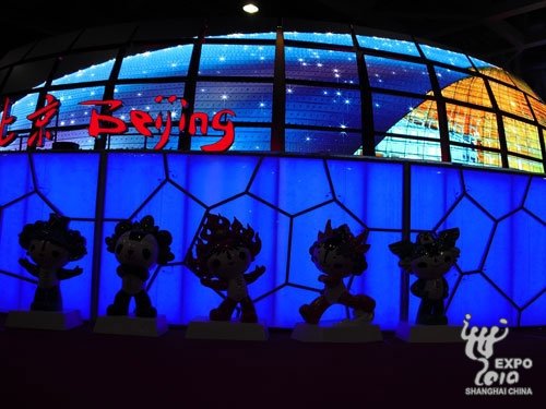 北京館設(shè)有80臺(tái)LED大屏幕,屏幕影像可配合展館外形的改變而不斷變化,使北京館成為上海世博會(huì)唯一具備“變形”功能的展館?⒐x式上,被五個(gè)可愛的“福娃”簇?fù)淼谋本^進(jìn)行了首次“變形”:這一刻,還只見美麗的金鯉在波光粼粼的“水立方”中暢游,剎那間卻變身為成群的白鴿盤旋飛翔,色彩斑斕的氣球從天壇祈年殿徐徐升起;這一刻,還沉醉于璀璨夜色中國(guó)家大劇院的亮麗風(fēng)采,不經(jīng)意間卻已幻化成雄偉的國(guó)家體育場(chǎng)“鳥巢”氣勢(shì)磅礴……80臺(tái)LED大屏幕在程序控制的機(jī)械臂帶動(dòng)下,循環(huán)往復(fù),翻轉(zhuǎn)變化,令人嘆為觀止。據(jù)悉,世博會(huì)期間,“變形”頻率還將根據(jù)參觀人流等情況進(jìn)行調(diào)整。