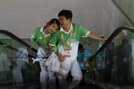 在世博園吃完午餐返回辦公區時,謝丹玲也要緊緊倚靠在朱國祥肩上。