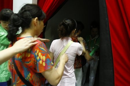 觀眾在謝丹玲的指引下,在黑暗的環境中體會盲人如何生活。