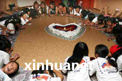 8月4日,在俄羅斯“海洋”全俄兒童中心,來自中國四川地震災區的孩子們和俄羅斯輔導員共同參加燭光晚會。新華社記者鄭悅攝