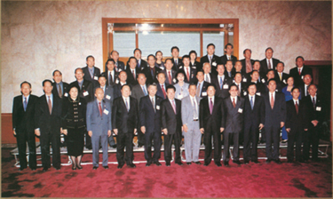 圖片:中共中央政治局常委、全國政協主席李瑞環(前排左七),全國政協副主席、中央統戰部部長王兆國(前排右六),全國政協副主席、中國和平統一促進會會長萬國權(前排左五)等與訪問團全體成員合影。