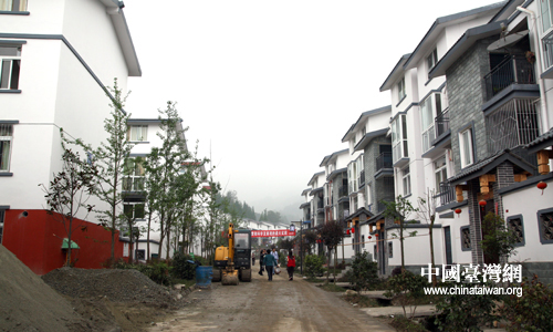 走進都江堰市向峨鄉棋盤村董家新院子安置點,寬闊的道路兩旁是聯排或獨棟的三層西式建筑,有些已經竣工并有村民入住,有些則還在修建當中。(中國臺灣網 田云鵬 攝)