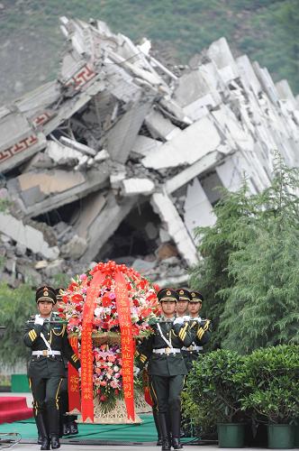 5月12日,紀念四川汶川特大地震一周年活動在四川省汶川縣映秀鎮舉行。伴隨著深情的《獻花曲》,20名禮兵抬起10個花籃,正步走向四川汶川特大地震紀念表盤,將花籃擺放在紀念表盤前。新華社記者丁林攝