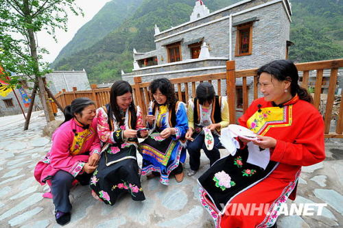 幾位羌族婦女聚在新居前一邊聊天一邊做著羌繡(4月26日攝) 新華社記者 何俊昌 攝