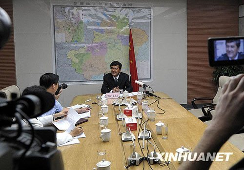 7月18日,新疆維吾爾自治區主席努爾·白克力(中)在烏魯木齊市接受境外媒體采訪。新華社記者趙戈攝