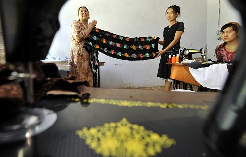 阿加汗·賽買提展示她的民族刺繡作品(7月31日攝)。現(xiàn)年57歲的阿加汗·賽買提是有“中國民間文化藝術(shù)之鄉(xiāng)”之稱的新疆哈密市回城鄉(xiāng)維吾爾族農(nóng)民,她是當(dāng)?shù)赜忻霓r(nóng)民畫家和剪紙藝術(shù)家,更是名揚(yáng)鄉(xiāng)里的民族手工藝刺繡能手。她的民族手工藝刺繡作品受到眾多維吾爾族群眾喜愛,年輕人結(jié)婚會(huì)整套訂制。看到商機(jī)的阿加汗·賽買提將自己的手藝傳給3個(gè)女兒,購置了專業(yè)設(shè)備,開辦起家庭式的民族刺繡加工廠。如今,她加工的民族繡品不僅銷往新疆各地,還有日本客商前來訂貨,一年能給這個(gè)家庭帶來4萬多元的收入。新華社記者 沈橋 攝