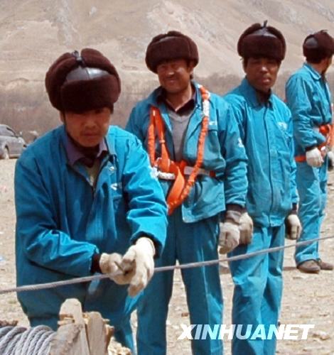 資料圖片:杜金玉(左二)和隊友們在玉樹災區電力搶險現場拉電纜(4月18日攝)。新華社發(何青 攝)