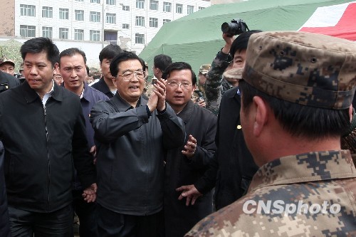 4月18日,中共中央總書記、國家主席、中央軍委主席胡錦濤飛抵玉樹,看望慰問地震災區干部群眾,實地指導抗震救災工作。 中新社發 盛佳鵬 攝