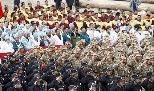 同日上午10時,在青海省省會西寧市新寧廣場,萬余名各界各族群眾聚集在一起,深切悼念玉樹地震遇難同胞。