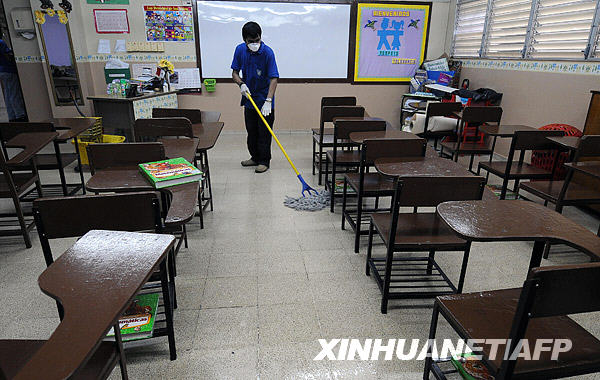 5月13日,在巴拿馬首都巴拿馬城,工作人員在一所學(xué)校的教室里擦地并消毒。當(dāng)天,巴拿馬新增4例甲型H1N1流感確診病例。新華社/法新