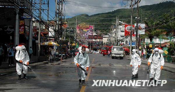 6月14日,工作人員在泰國普吉島的一條街道上噴灑消毒劑,以防范甲型H1N1流感疫情。截至北京時間6月15日14時,世界衛(wèi)生組織共確認(rèn)泰國甲型H1N1流感確診病例8例。新華社/法新