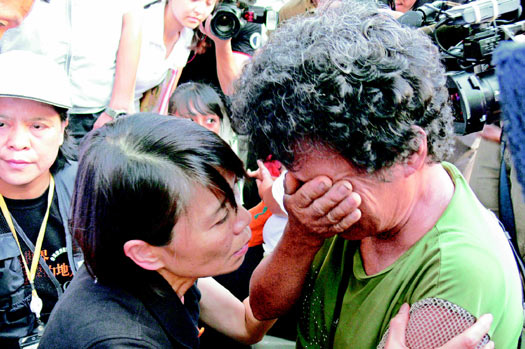 馬英九夫人周美青昨天到臺東縣嘉蘭村慰問災民,失去家園的婦人見到她痛哭失聲,周美青半跪著緊擁婦人,輕聲安慰:“人在就好!我們還有希望!眻D片來源:臺灣《聯合報》