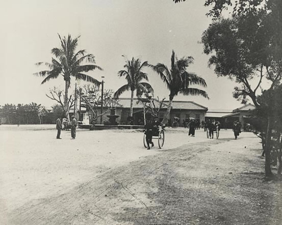 高雄港站(舊稱高雄驛),位于現今的鼓山一路,興建于公元1908 年,是第二代的打狗停車場,圖中前方可見郵筒、噴泉、街燈及人力車,并有椰影構成南國氣象。此照片出版于日本統治臺灣時期的大正12 年(1923),攝影者不詳。
