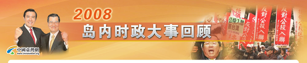 1月27日,國民黨、民進黨兩組參選人完成參選登記,臺灣地區第12任正副領導人選舉正式啟動。3月22日投票。中國國民黨候選人馬英九、蕭萬長獲勝,得票765萬9014張,得票率為58.45%;民進黨候選人謝長廷、蘇貞昌得票544萬4949張,得票率為41.55%。臺灣完成第二次政黨輪替。【全文】