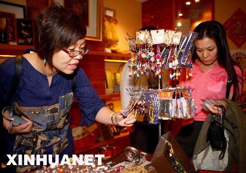 7月7日,兩位來自北京的游客在阿里山森林生態公園一商店內選購紀念品。 大陸居民赴臺旅游首發團抵達臺灣后,開始奔赴臺灣一些著名景點,在領略臺灣自然景色的同時,開始抓緊時間為親朋好友選購一些獨具臺灣特色的旅游紀念品。 新華社記者 陳建力攝