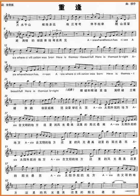 《重逢》突出了亞運會的理念:亞運會不僅是亞洲的體育盛會,也是亞洲兄弟姐妹四年一次的友誼聚會。歌詞“眼睛和眼睛重逢”,“珠江彎彎伸手相牽”、“隔山遙望,跨海相約”寓意深遠,表明亞洲雖然地域遼闊,但亞洲人民之間深厚的友誼縮短了彼此的距離。“珠江彎彎伸手相牽”音樂部分用廣東童謠《落雨大》作為前奏,突出了濃濃的廣東特色。Asia(亞洲)一詞原意是“太陽升起的地方”,《重逢》用“Asia,太陽升起的地方。Asia,古文明的殿堂。啊,這里的風光最美。啊,這里的陽光最亮”。四句將歌曲推向高潮。