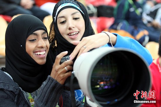 亞運會不只是運動員競技的舞臺,五湖四海的觀眾也匯集在這里,傳遞著友誼和歡樂。圖為兩位來自也門的美女對記者的“大炮”鏡頭產生了興趣。 中新社記者 張雷 攝