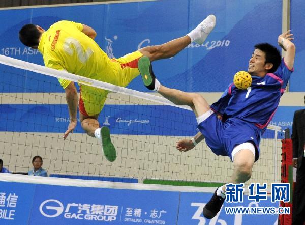 11月25日,中國選手楊家鵬(左)在比賽中攔截日本選手寺本進的進攻。當日,在廣州舉行的第16屆亞運會藤球男子雙人預賽中,中國隊以0比2不敵日本隊。新華社記者陳曄華攝