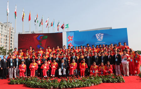 廣州亞運會勝利閉幕,運動員村并沒有“休息”,經過4天緊鑼密鼓地轉場、準備,迎來了廣州亞殘運會的客人。8日,廣州2010年亞洲殘疾人運動會運動員村開村暨中國體育代表團入村歡迎儀式,在亞運城運動員村升旗廣場隆重舉行。中國殘聯黨組書記、理事長,中國殘奧委員會主席、廣州亞殘運會組委會執行主席王新憲;中國殘聯黨組副書記、常務副理事長,廣州亞殘運會組委會副主席王乃坤女士;中國殘聯黨組成員、副主席,中國殘奧委員會執行主席、廣州亞殘運會組委會副主席、中國體育代表團團長呂世明;國家體育總局黨組成員、副局長、中國殘奧委會執行主席、廣州亞殘運會組委會副主席、中國體育代表團團長馮建中;中國殘聯黨組成員、副理事長、體育部主任,中國殘奧委員會常務副主席,廣州亞殘運會組委會副秘書長、中國體育代表團執行團長賈勇;亞殘奧委會秘書長馬利尼·拉賈薩加蘭女士;廣東省委常委、廣州市委書記、廣州亞殘運會組委會副主席兼秘書長張廣寧;廣東省副省長、廣州亞殘運會組委會副主席林木聲;廣州市委副書記、廣州市市長、廣州亞殘運會組委會副主席萬慶良;廣州市委常委、亞運城賽區領導小組組長、運動員村村長孔少瓊女士;廣州市委常委、秘書長陳如桂;廣州市副市長、廣州亞殘運會組委會常務副秘書長許瑞生、廣州市副市長、廣州亞殘運會組委會副秘書長陳國和廣州市政府秘書長謝曉丹等領導和嘉賓,以及200名中國體育代表團成員出席了儀式。