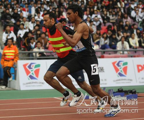人民網(wǎng)廣州12月14日電(記者 劉龍攝影報道)12月14日,在廣州2010年亞殘運(yùn)會田徑男子200米T11級比賽中,T11級比賽是有引導(dǎo)員領(lǐng)跑的比賽。