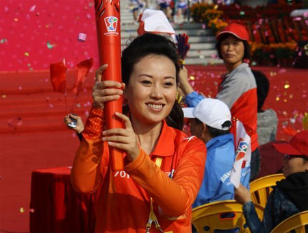 9點40分左右,火炬護衛隊護送火種燈和火炬上臺,廣州市檢察院黨組書記、檢察長王福成上臺點燃火種盆;9點42分左右,廣州市委常委、廣州經濟技術開發區管委會主任、黨工委書記、蘿崗區委書記凌偉憲上臺點燃火炬交給第一棒火炬手中國殘聯愛心大使、廣州亞殘運會愛心大使南欣并宣布火炬傳遞活動開始;9點45分左右第一棒火炬手正式起跑。