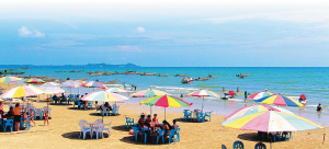東興以美麗的山海風光、優美的海濱浴場、濃郁的京族風情和方便快捷的跨國旅游,形成了以跨國旅游為龍頭,“上山下海又出國”的旅游知名品牌。圖為游人如織的東興金灘。
