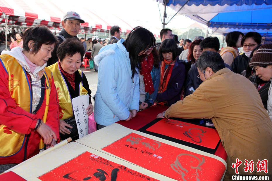 2月12日下午,冒著冷風細雨,臺灣數千名書法家及愛好者在臺北揮毫,迎接辛卯新春。現場翰墨飄香,展現書藝傳承,充滿文化氣息。中新社記者 董會峰 攝