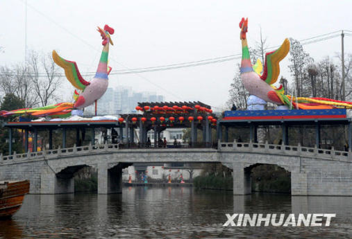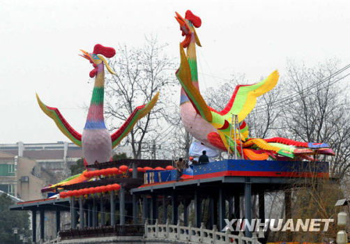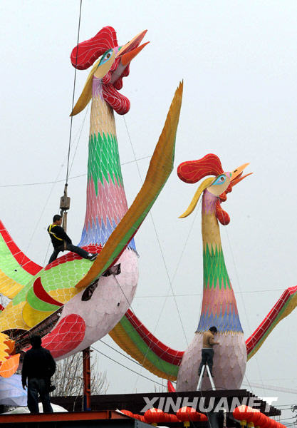 2月8日,藝人們?cè)谀暇┌樦薰珗@安裝臺(tái)灣鳳凰燈。當(dāng)日,由臺(tái)灣藝人扎制的兩只巨型鳳凰燈在南京夫子廟附近的白鷺洲公園安裝到位。這兩只臺(tái)灣鳳凰燈每只長(zhǎng)17米,高12米,將在江蘇與臺(tái)灣首次聯(lián)合舉辦的“龍騰虎躍,蘇臺(tái)同輝” 江蘇·秦淮燈會(huì)暨南京夫子廟春節(jié)燈會(huì)上點(diǎn)亮。新華社記者 孫參攝