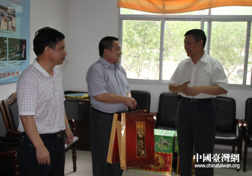 中國臺灣網9月25日消息 中秋前期,湖北省十堰市政協副主席王慶華一行在十堰市臺辦主任曹奎、副主任郭升平的陪同下來到臺企阿里山公司,看望慰問在那里投資興業的臺灣客商賴昶浚父子及專職茶葉師傅三人,了解臺商們在十堰的工作、生活情況,為他們送去了中秋月餅和節日祝福。