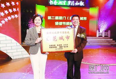 市委常委、宣傳部部長(zhǎng)洪碧玲為湖里區(qū)創(chuàng)建學(xué)習(xí)型家庭授牌。