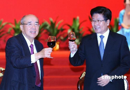 第五屆兩岸經貿文化論壇7月11日在長沙開幕,當晚,東道主湖南省委舉行晚宴招待論壇嘉賓。圖為中國國民黨主席吳伯雄(左)與中共湖南省委書記張春賢共同舉杯慶祝論壇開幕。 中新社發 宋吉河 攝