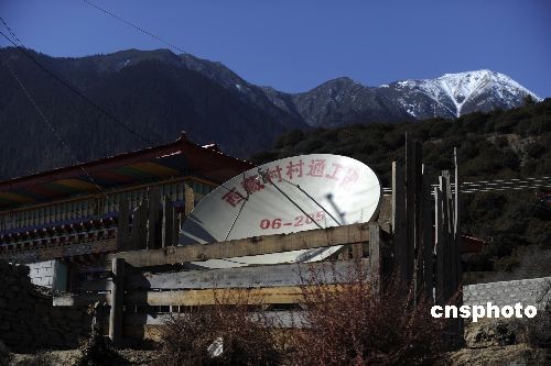 資料圖片:2009年初春,西藏林芝米林縣農村的廣播電視“村村通”工程衛星天線。 中新社發 廖攀 攝
