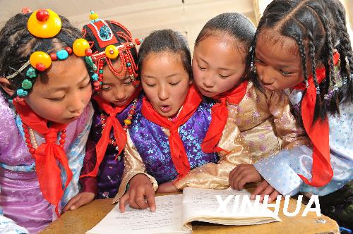 資料圖片:3月26日,昌都地區(qū)實驗小學學生嘎松曲西(中)與同學們一起念課文。新華社記者 何俊昌 攝