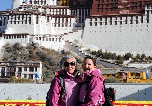 資料圖片:4月5日,兩名來(lái)自德國(guó)的游客在拉薩布達(dá)拉宮前合影。 新華社記者 覺(jué)果 攝