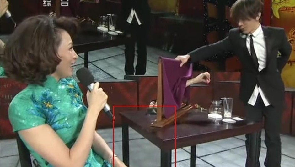 網(wǎng)友揭秘劉謙春晚魔術。桌子下面有個鏡子,就是說實際上只有一半位置是空間,另一半是個三角形的箱子,里面藏了人。注意看劉謙開始做的那個位置桌子下面的顏色,很不自然。