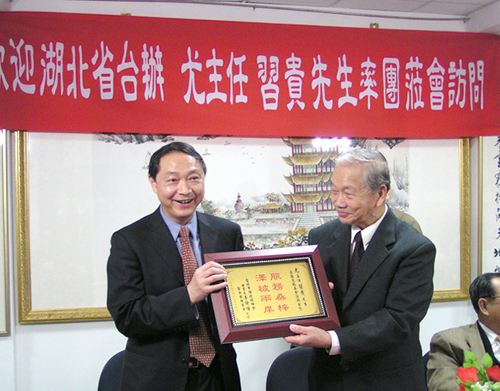 2006年12月,以尤習貴主任任團長的湖北省宗教文化團赴臺交流考察。圖為臺北市湖北同鄉會在歡迎宴會上向省臺辦贈送牌匾。(資料圖片)
